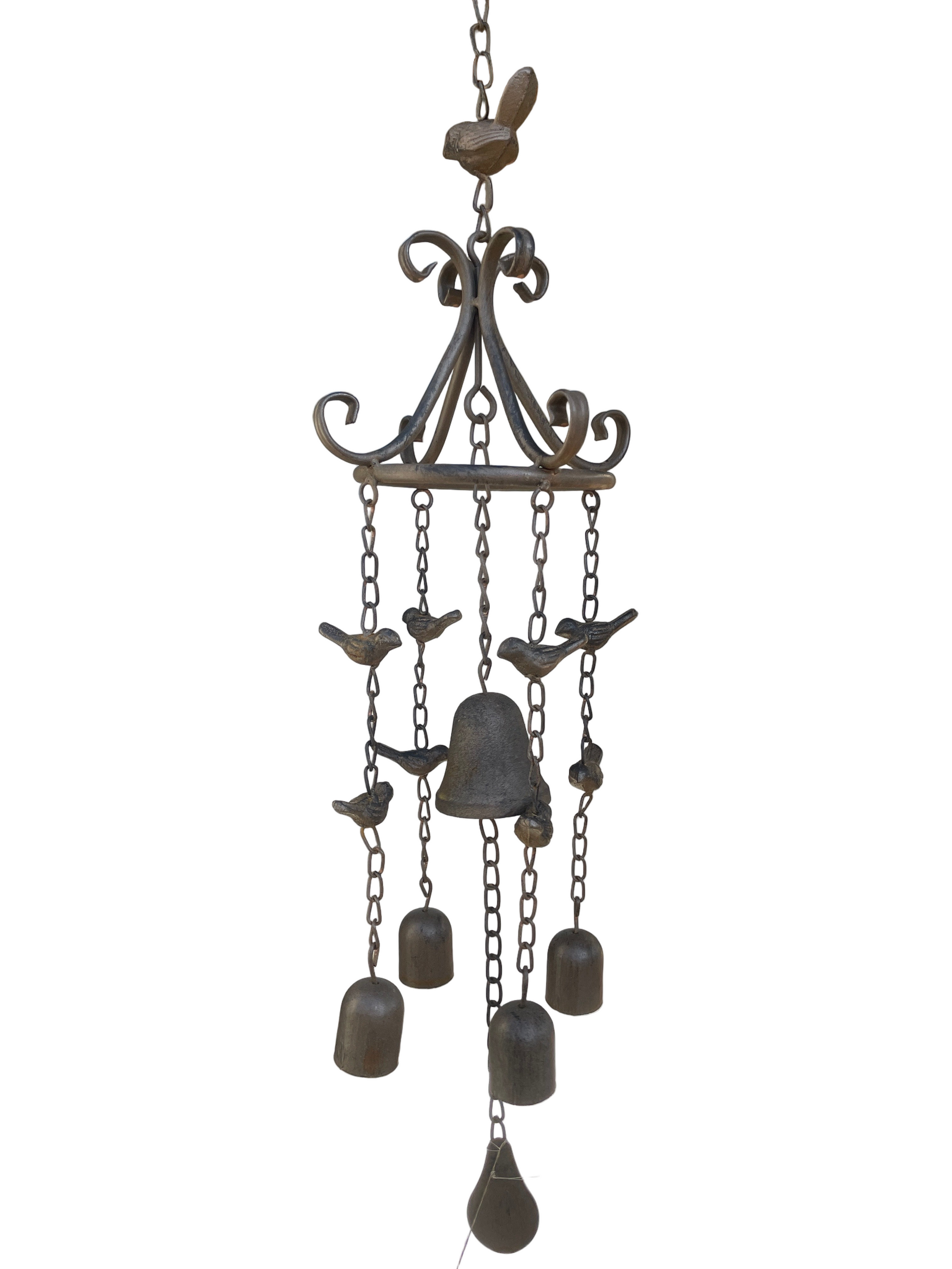 The Cast Iron Bell and Birds Chime Ornament combines beautiful visual appeal with gentle melodic sounds to enhance your garden experience. This charming piece features delicate bird motifs alongside a traditional bell, creating both a decorative focal point and a soothing sound element.